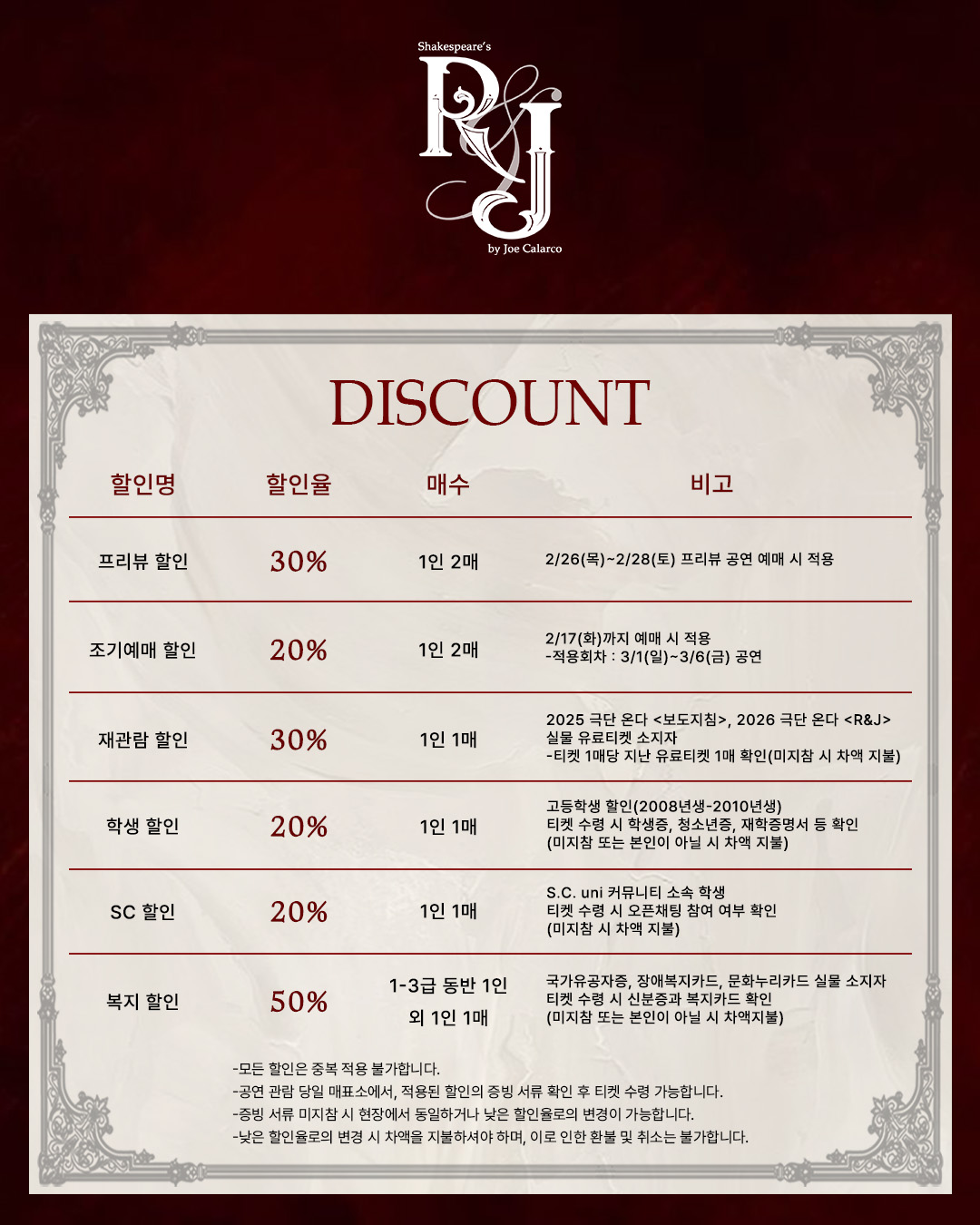 - 관람일 2일전 ~ 취소기한까지: 티켓금액의 30%