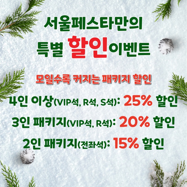 - 2026 창원 오픈 기념 4인이상 패키지 25% 할인 (VIP석, R석, S석에 한해 4매 이상 예매 시 적용 / 부분취소 불가)