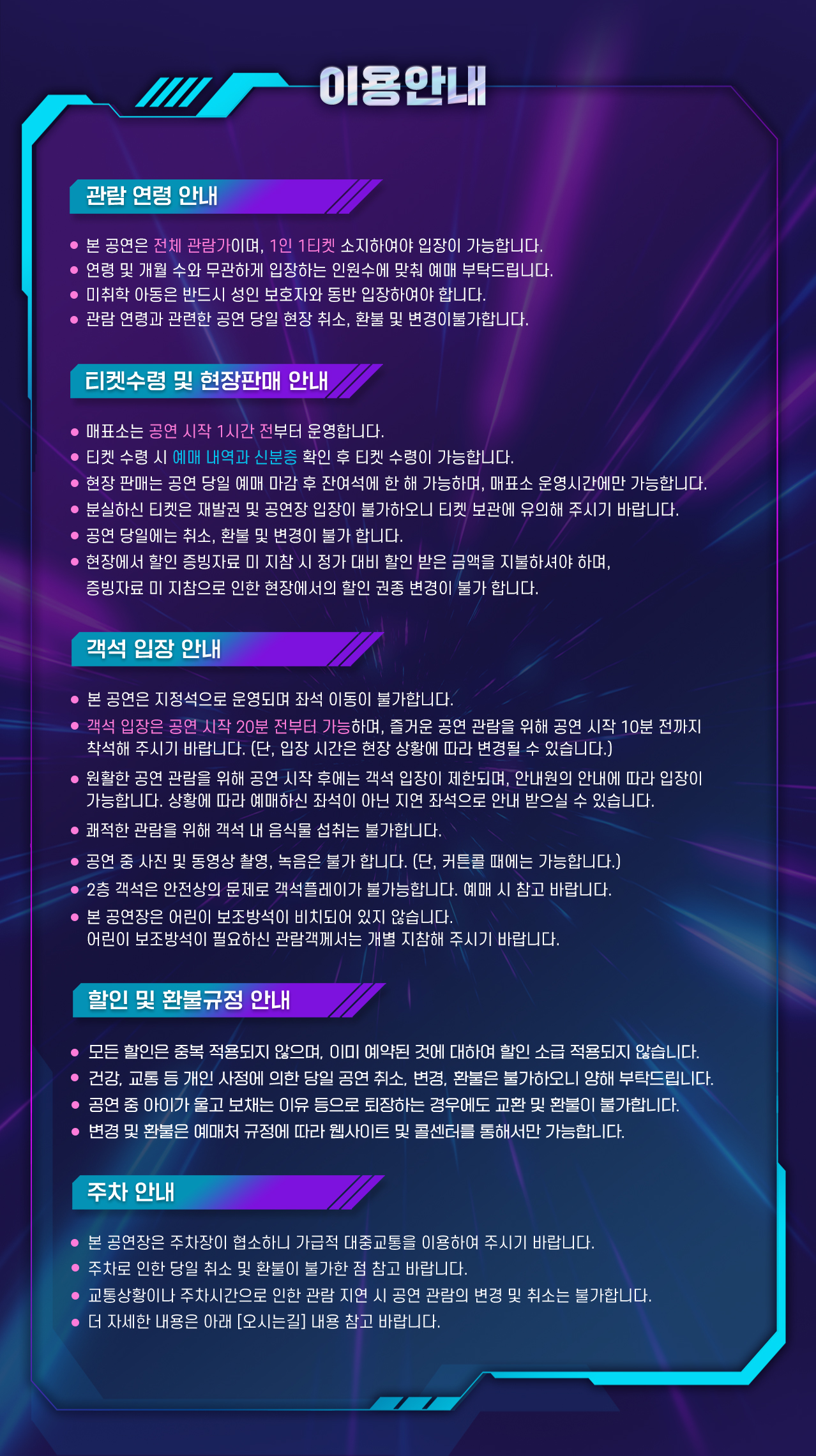 - 예매 후 7일 이내 취소시 티켓 금액 전액이 환불됩니다.(예매 수수료 제외)