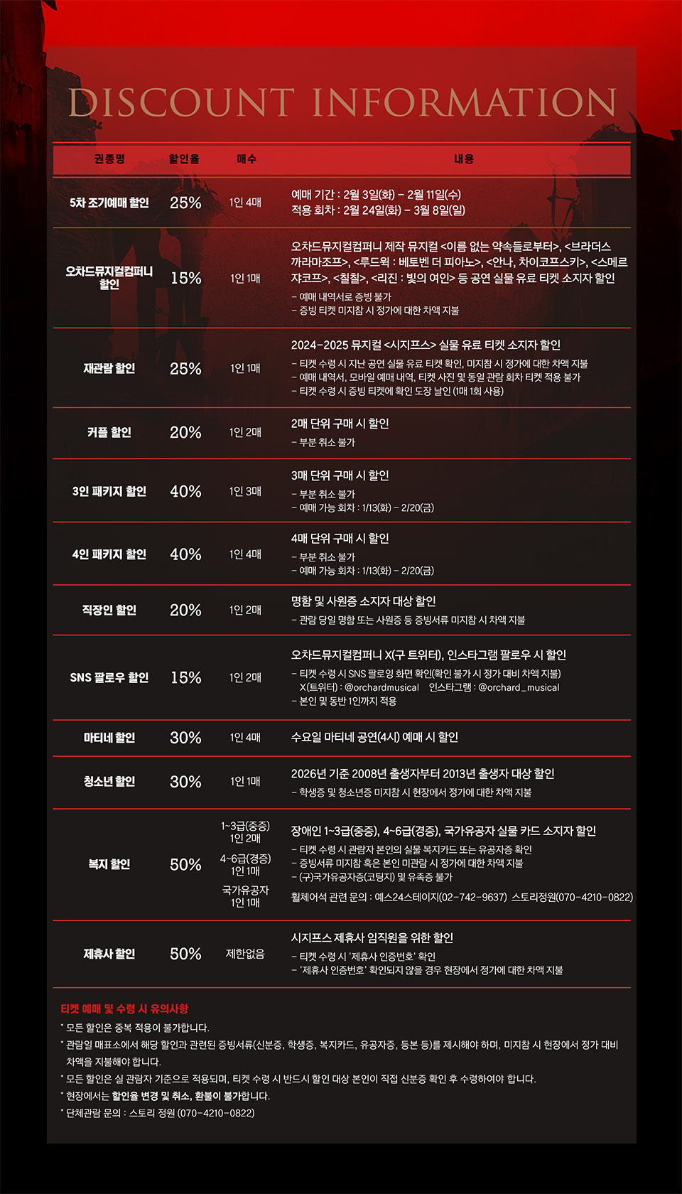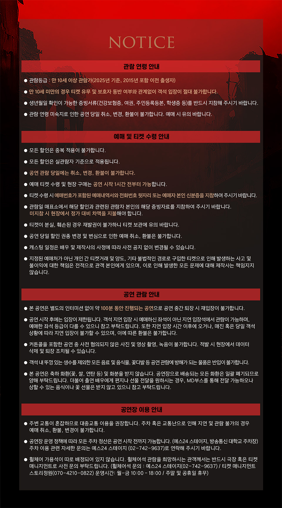 - 관람일 2일전 ~ 취소기한까지: 티켓금액의 30%