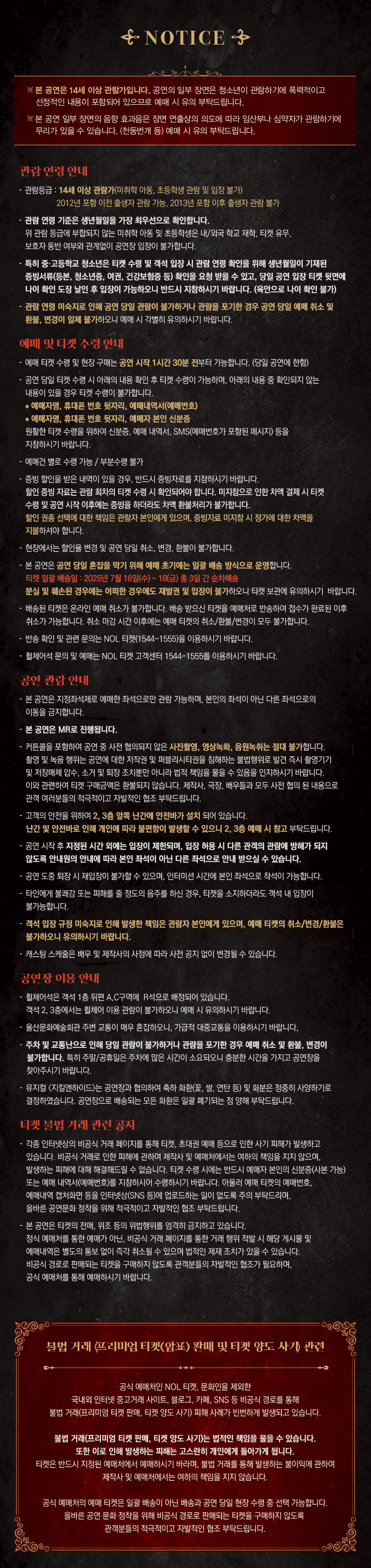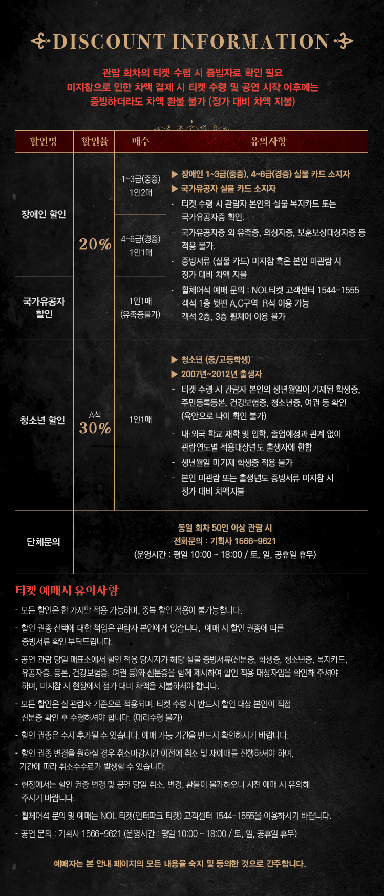 - 관람일 2일전 ~ 취소기한까지: 티켓금액의 30%