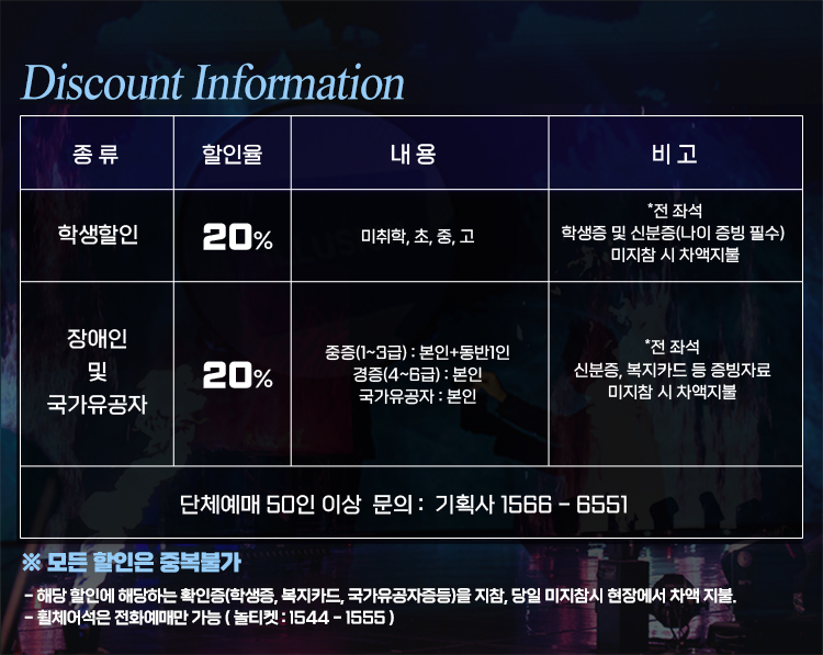 - 예매 후 7일 이내 취소시 티켓 금액 전액이 환불됩니다.(예매 수수료 제외)
