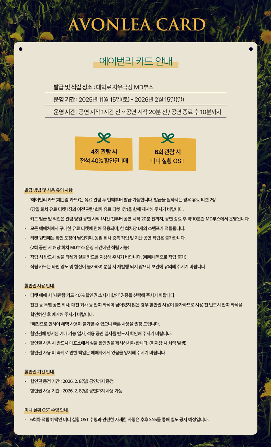 * 12월 17일부터 마티네 공연(수요일 오후 3시 30분)이 추가되며, 1월 5일부터 일요일 6시 공연 추가, 화요일 공연이 없습니다.
