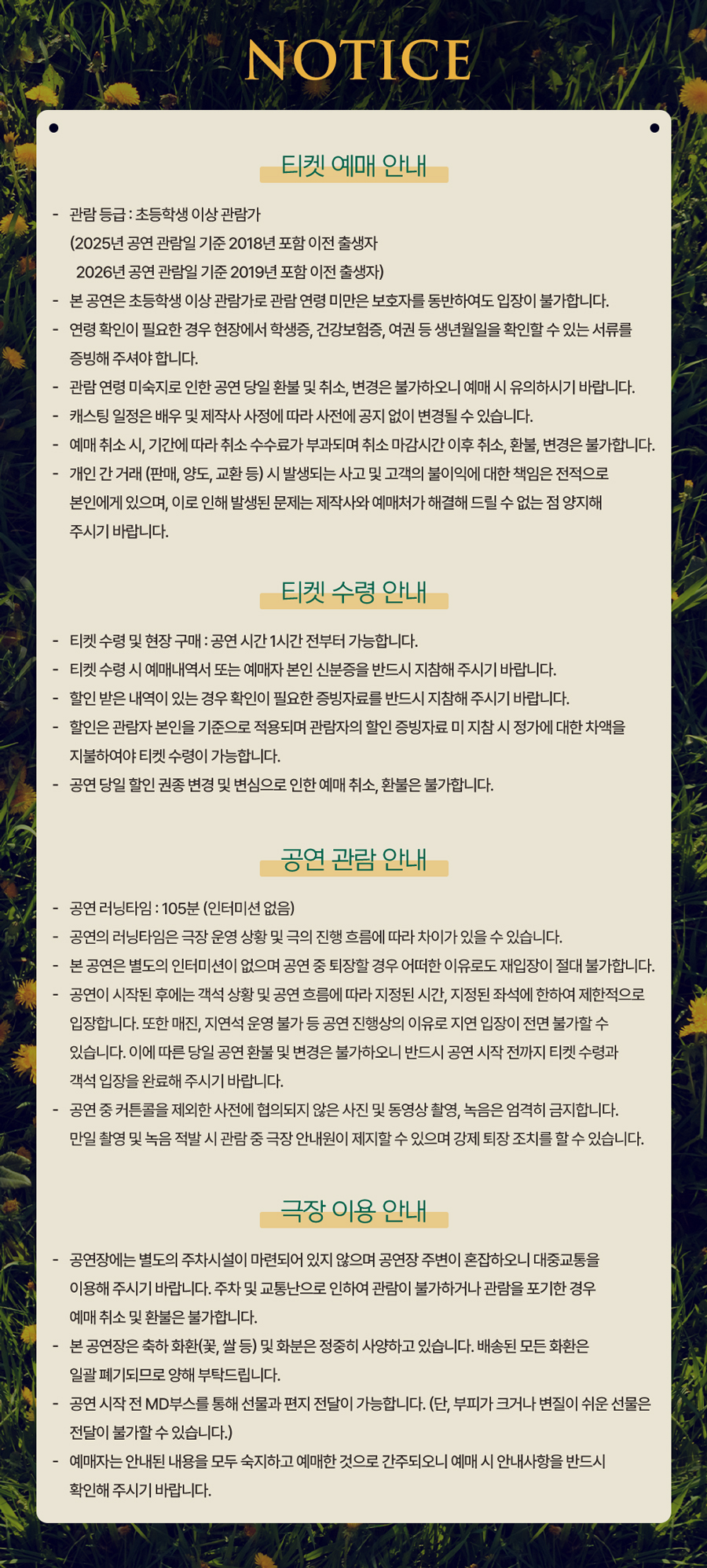 ※ 일부 회차 및 좌석은 기획사 사정으로 인해 사전 마감될 수 있습니다.