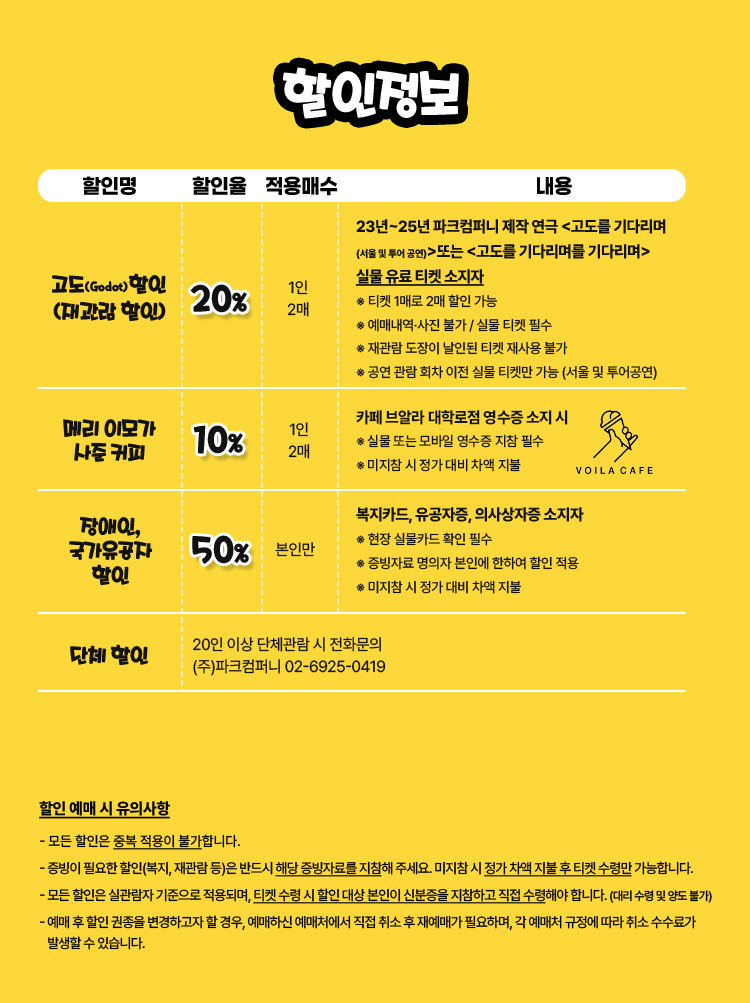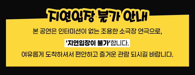 - 공연시간 : 화, 목, 금 20:00 | 수 16:00 | 토, 일, 공휴일 14:00, 17:00 (월요일 공연 없음)