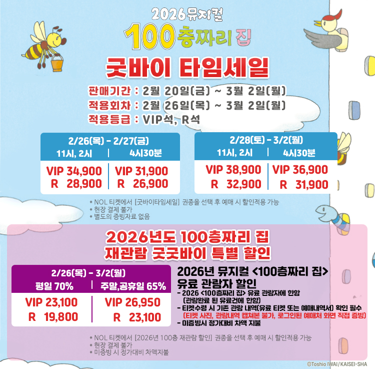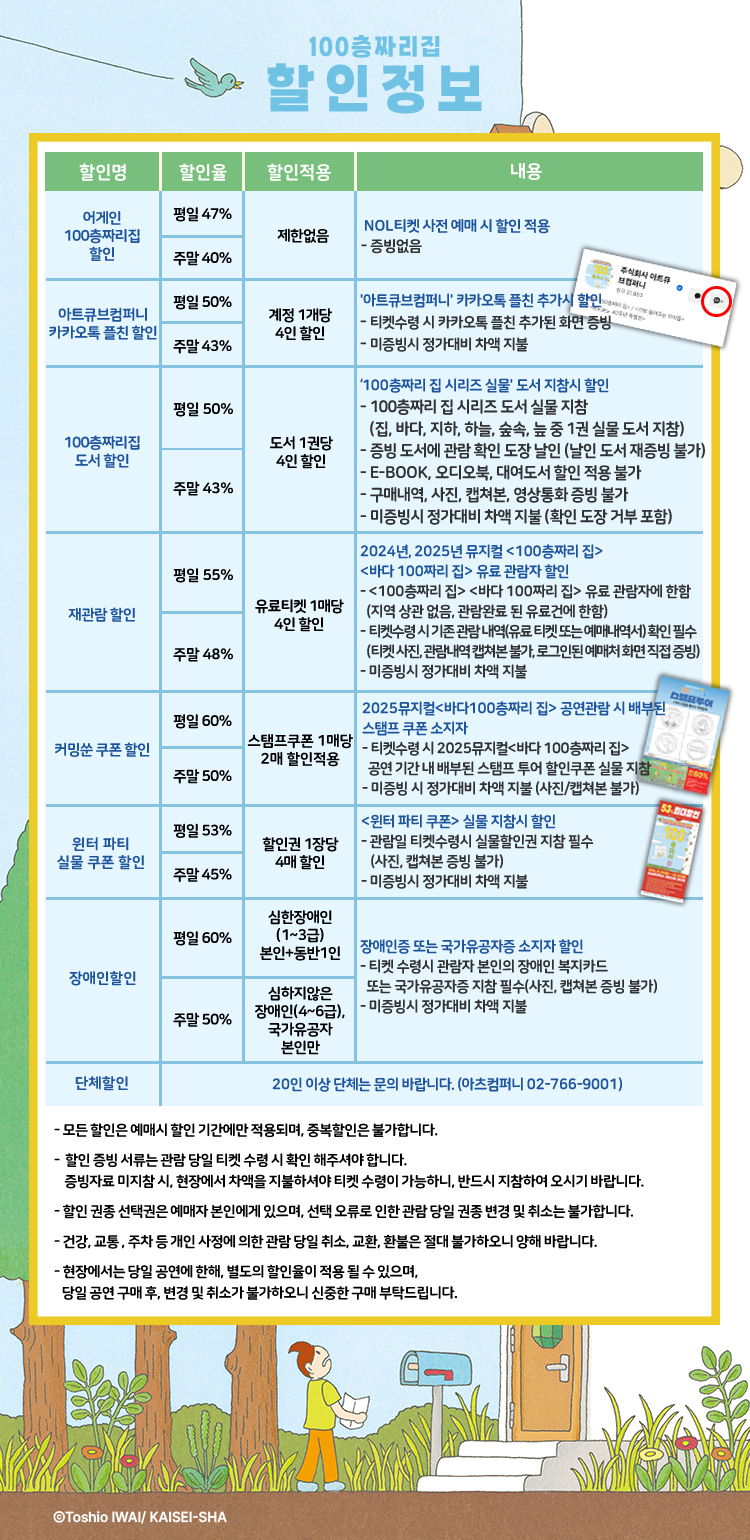 화,수,목 11시, 14시 ㅣ 금,토,일 11시, 14시, 16시30분 (월 공연없음)