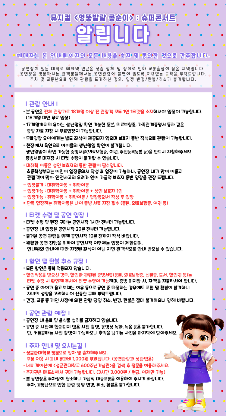 - 예매 후 7일 이내 취소시 티켓 금액 전액이 환불됩니다.(예매 수수료 제외)