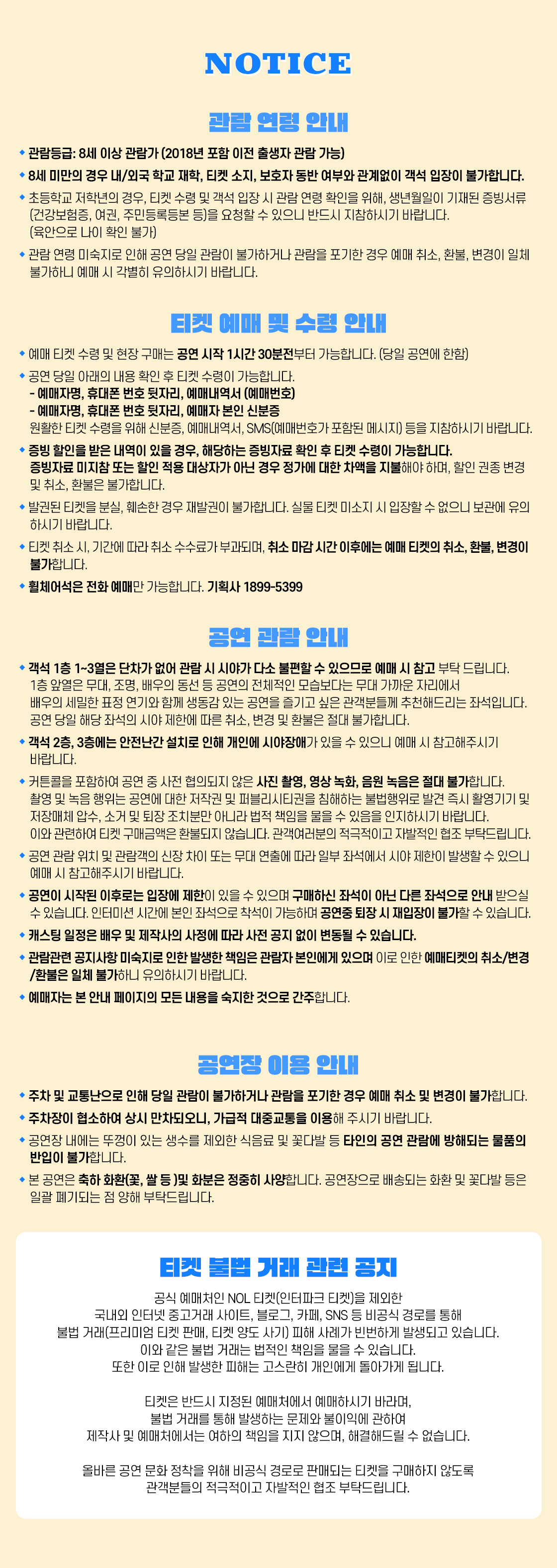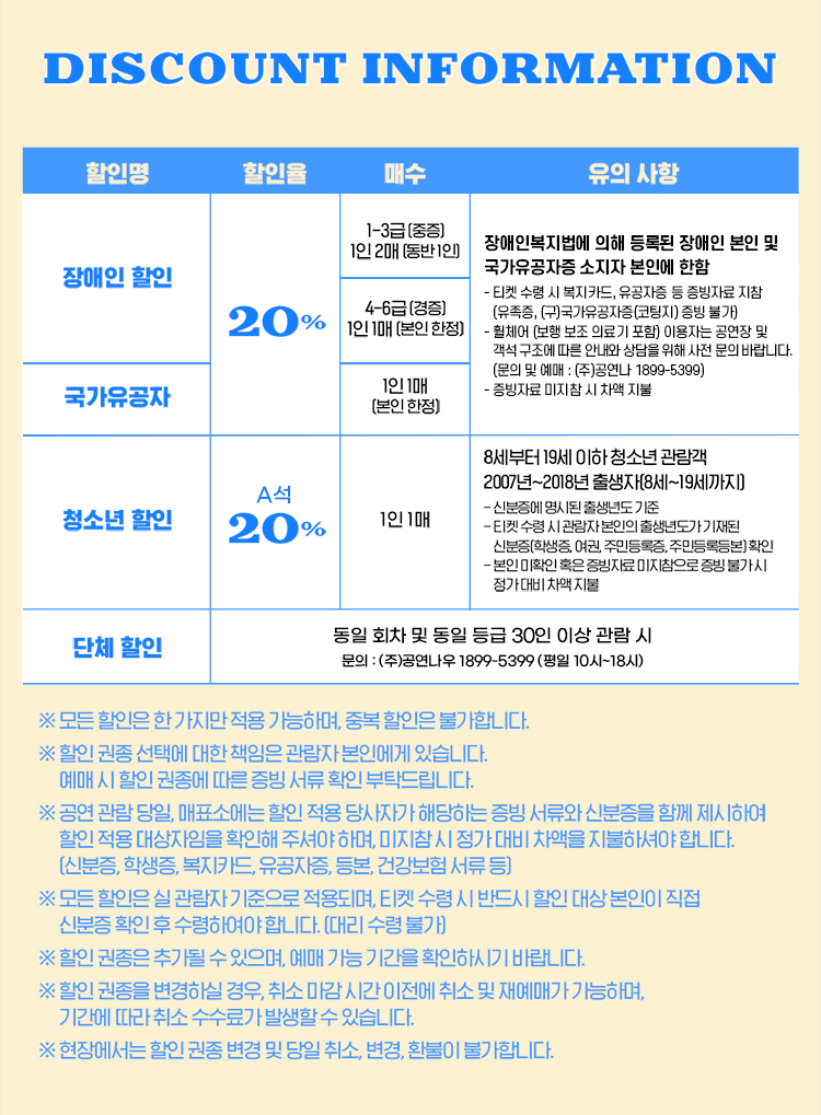- 예매 후 7일 이내 취소시 티켓 금액 전액이 환불됩니다.(예매 수수료 제외)