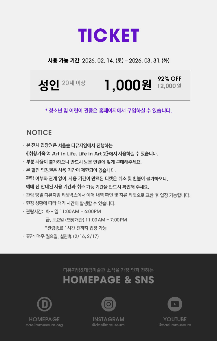 - 본 할인 입장권은 서울숲 디뮤지엄 <취향가옥 2: Art in Life, Life in Art 2>전시에서 사용 가능합니다. (성인/전시입장권)