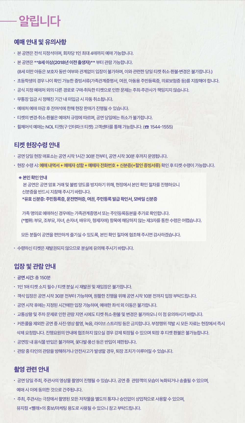 - 관람일 2일전 ~ 취소기한까지: 티켓금액의 30%