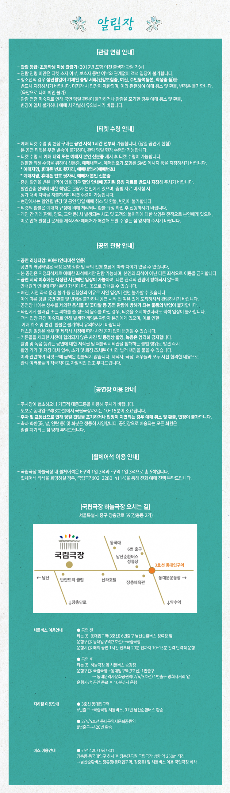 화·목 19:30 / 수·금 15:00, 19:30 / 주말 및 공휴일 14:00, 18:00 (월 쉼)