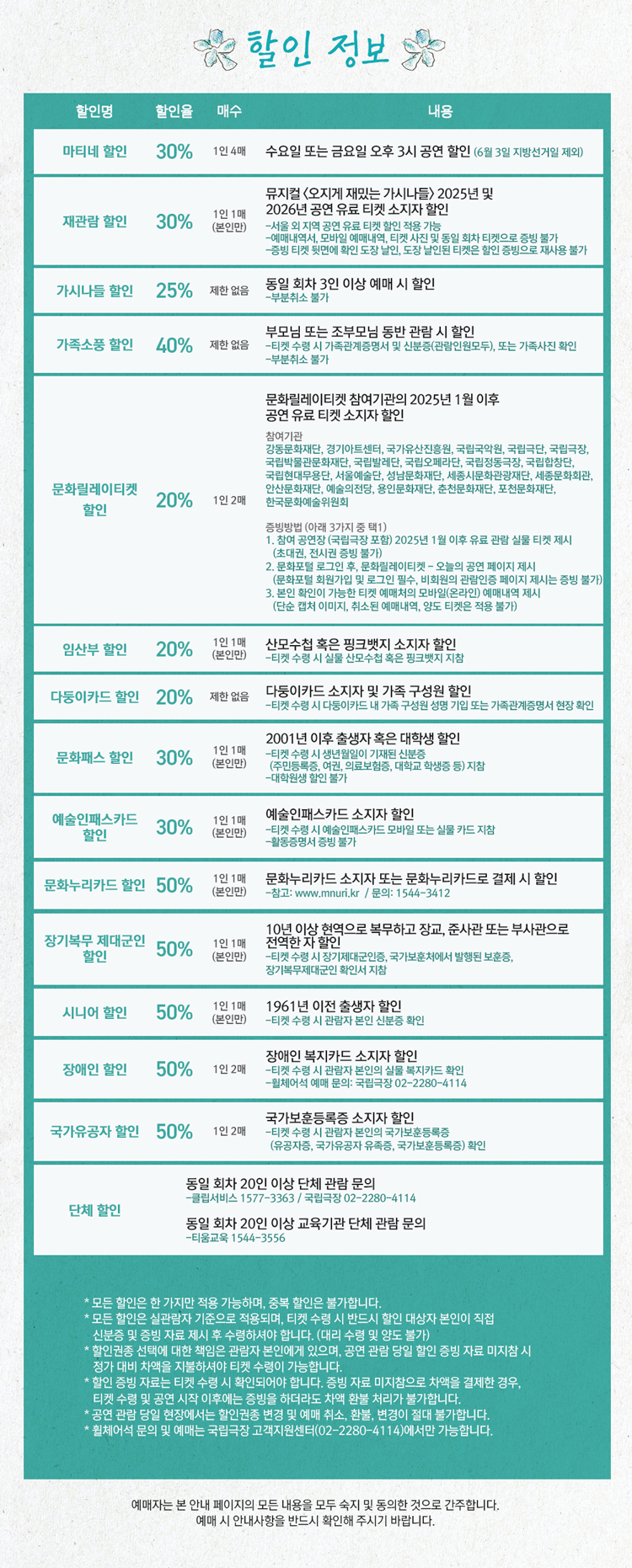 - 특정 기간, 특정 공연일에만 판매하는 가격이 있으니 예매 전 [가격 전체 보기]를 눌러 확인해 주세요.