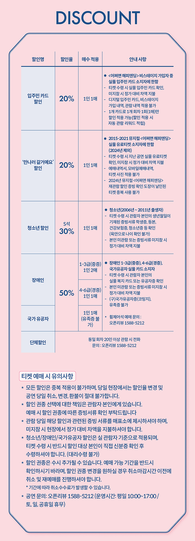 - 관람일 2일전 ~ 취소기한까지: 티켓금액의 30%