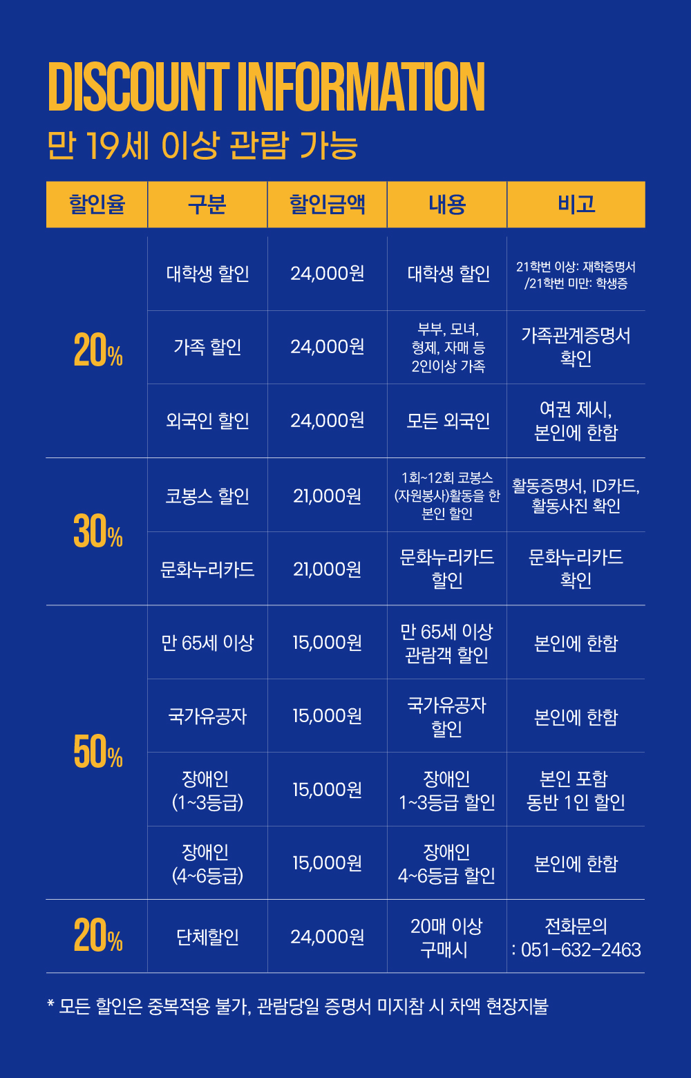 - 관람일 2일전 ~ 취소기한까지: 티켓금액의 30%