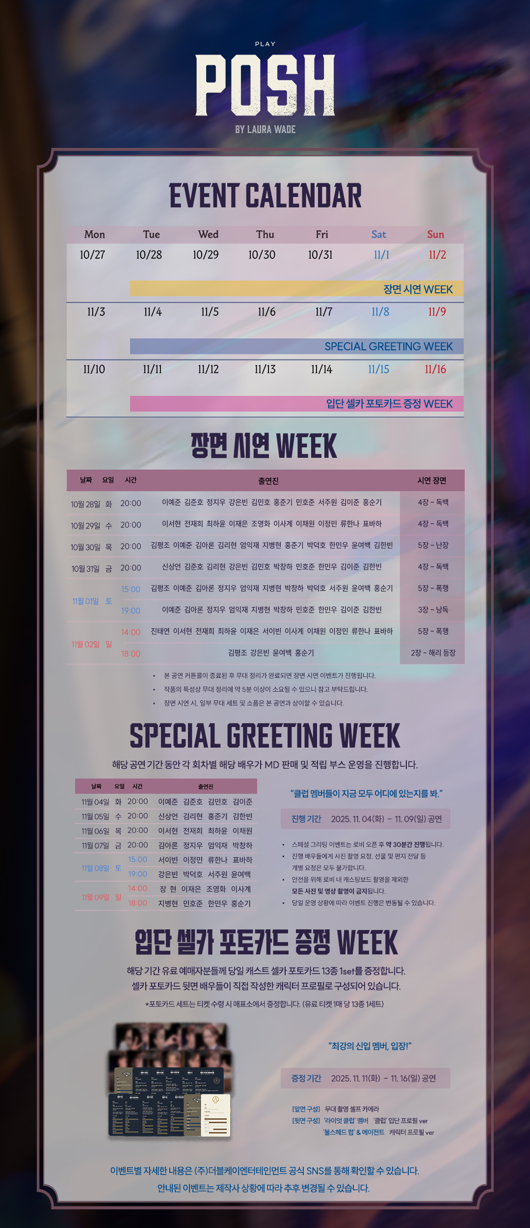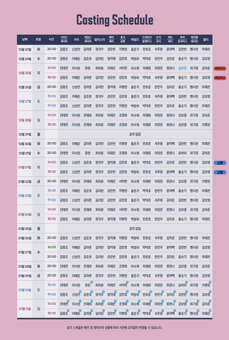 화, 수, 목, 금 8시 / 토 3시, 7시 / 일, 공휴일 2시, 6시 / 월 공연없음