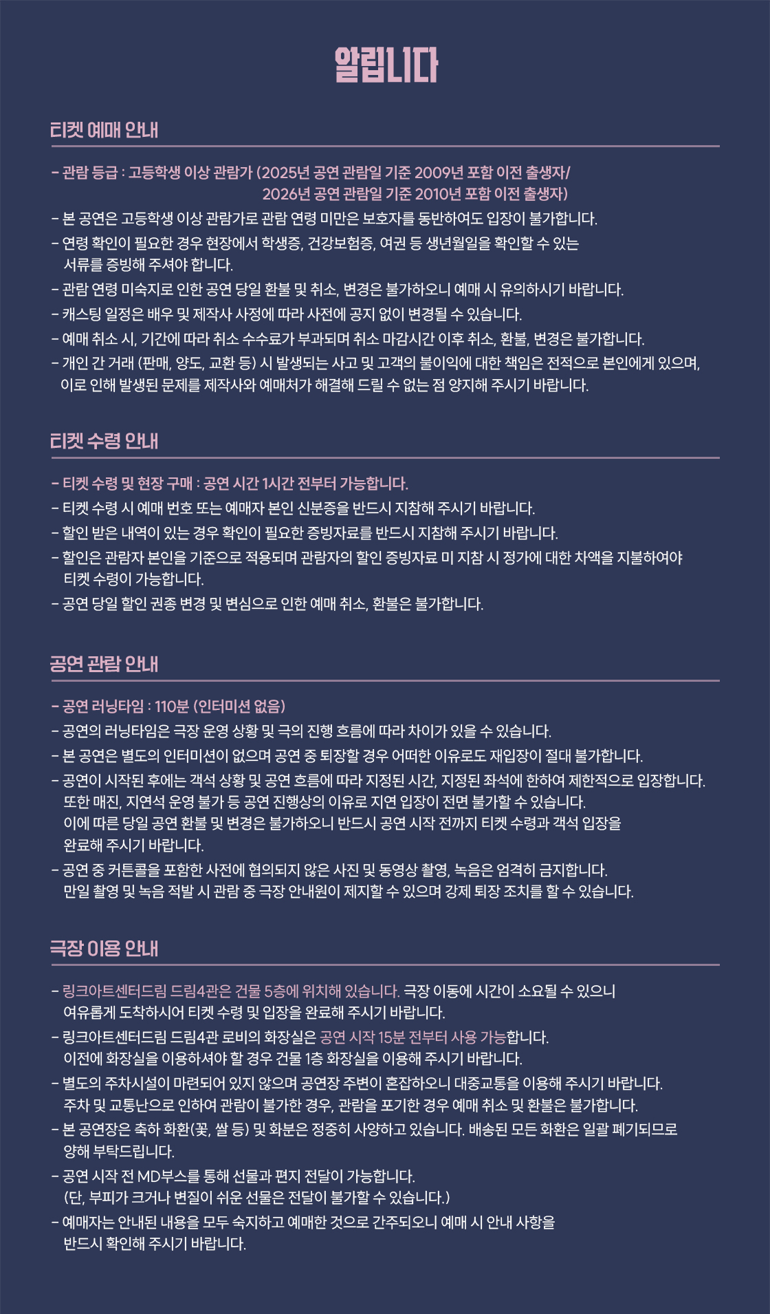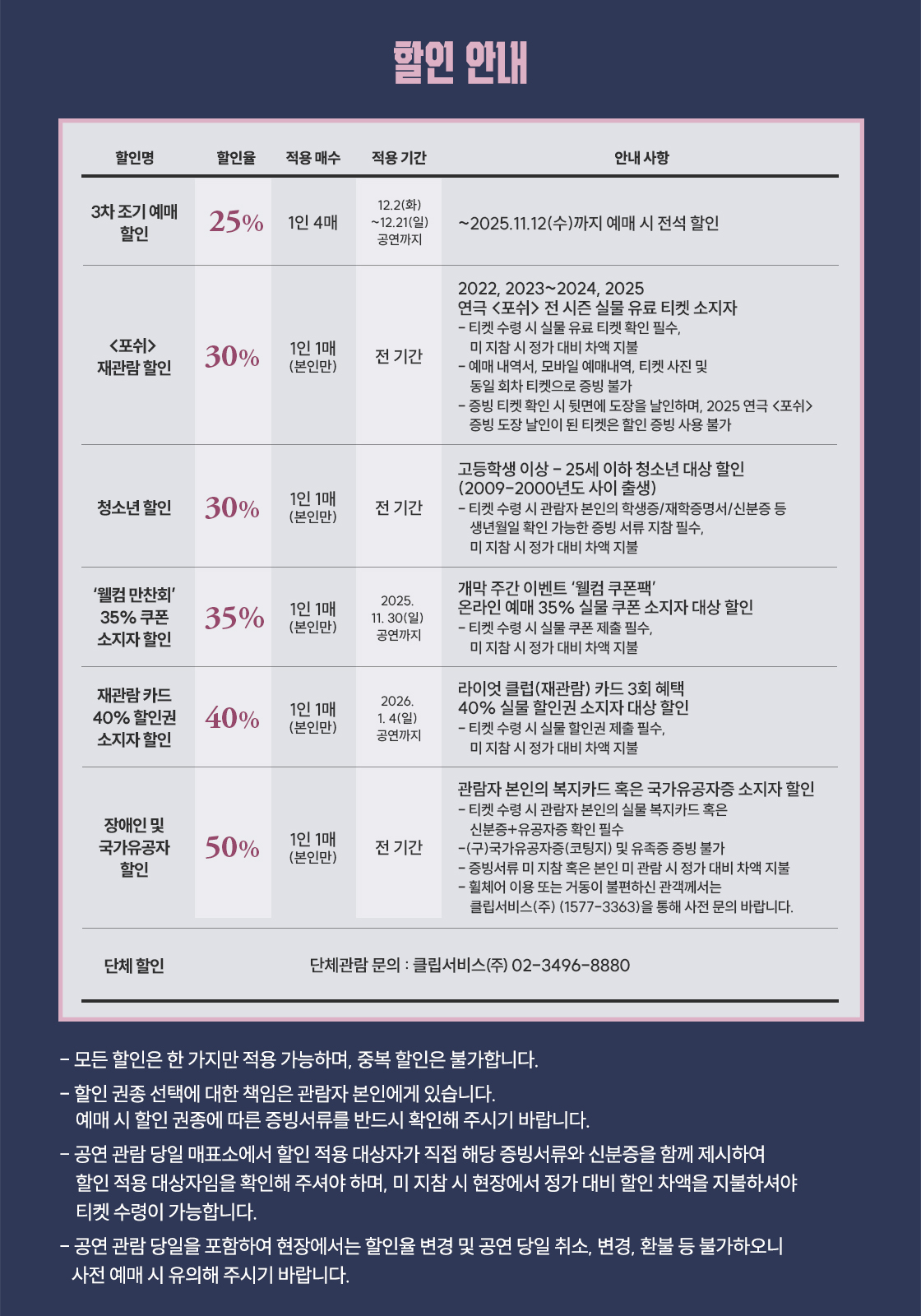 - 특정 기간, 특정 공연일에만 판매하는 가격이 있으니 예매 전 [가격 전체 보기]를 눌러 확인해 주세요.