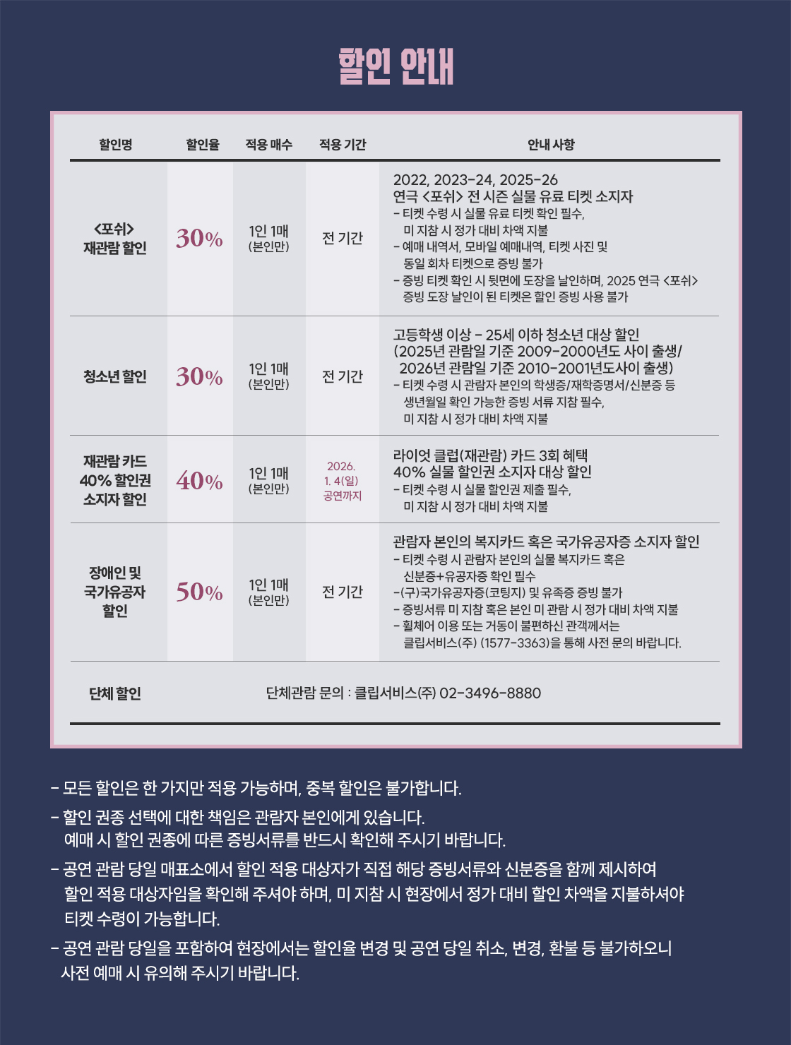 - 관람일 2일전 ~ 취소기한까지: 티켓금액의 30%