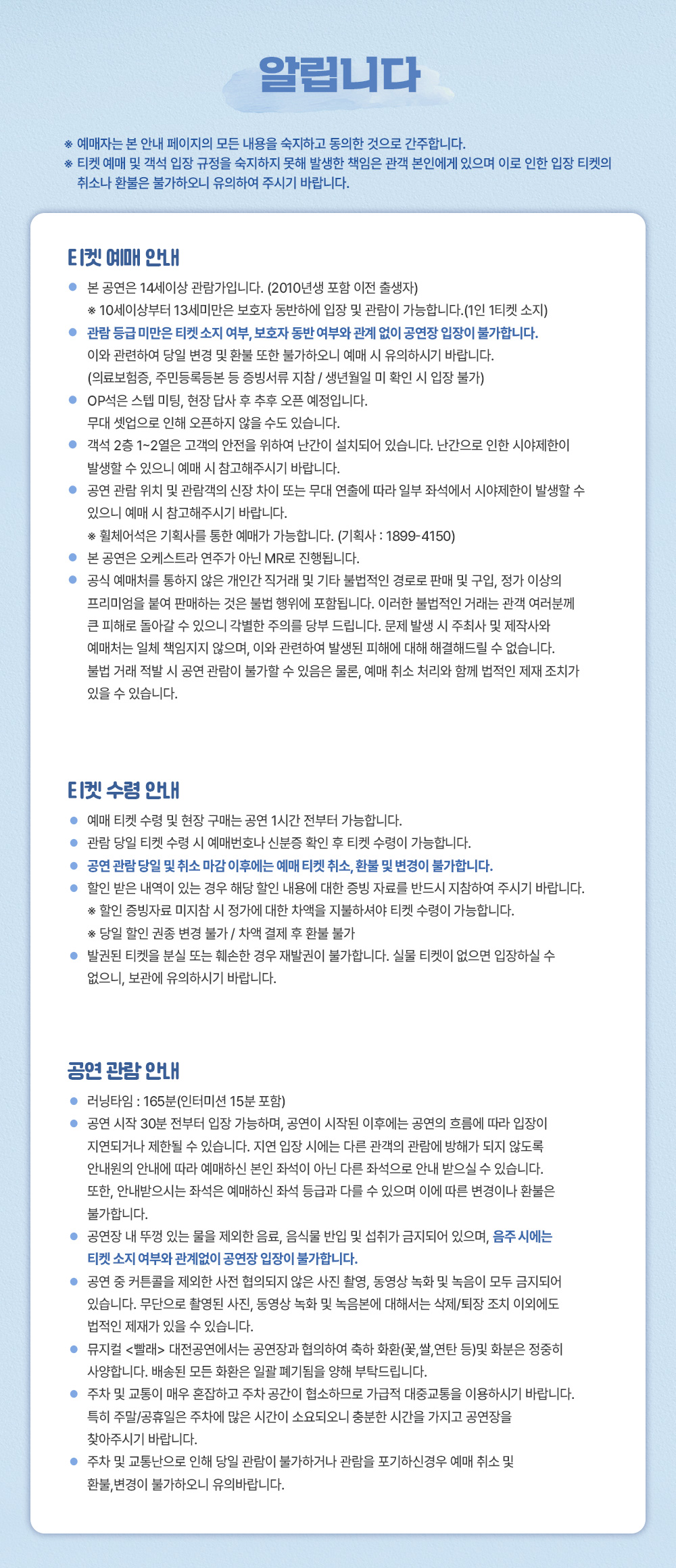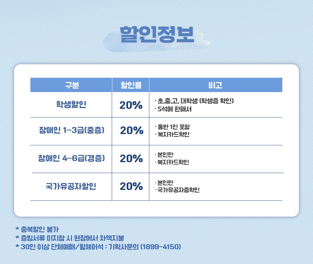 - 예매 후 7일 이내 취소시 티켓 금액 전액이 환불됩니다.(예매 수수료 제외)