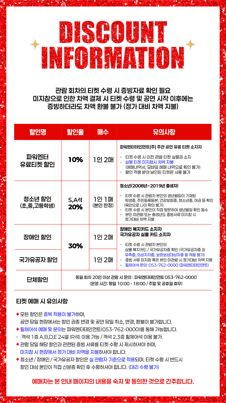 - 특정 기간, 특정 공연일에만 판매하는 가격이 있으니 예매 전 [가격 전체 보기]를 눌러 확인해 주세요.
