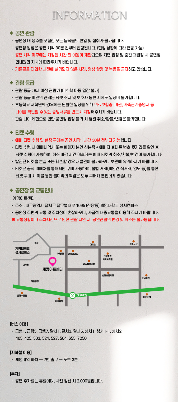 - 관람일 2일전 ~ 취소기한까지: 티켓금액의 30%