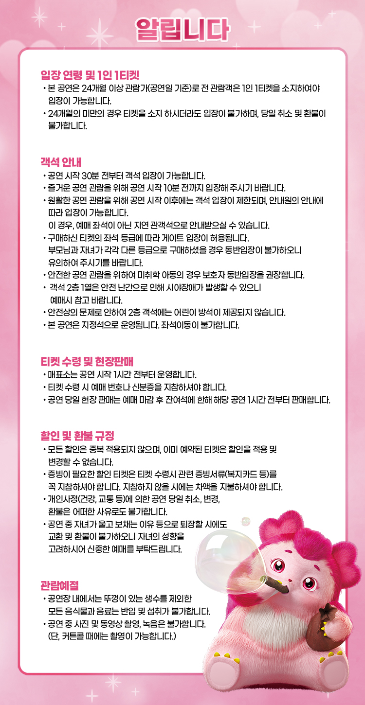 - 예매 후 7일 이내 취소시 티켓 금액 전액이 환불됩니다.(예매 수수료 제외)