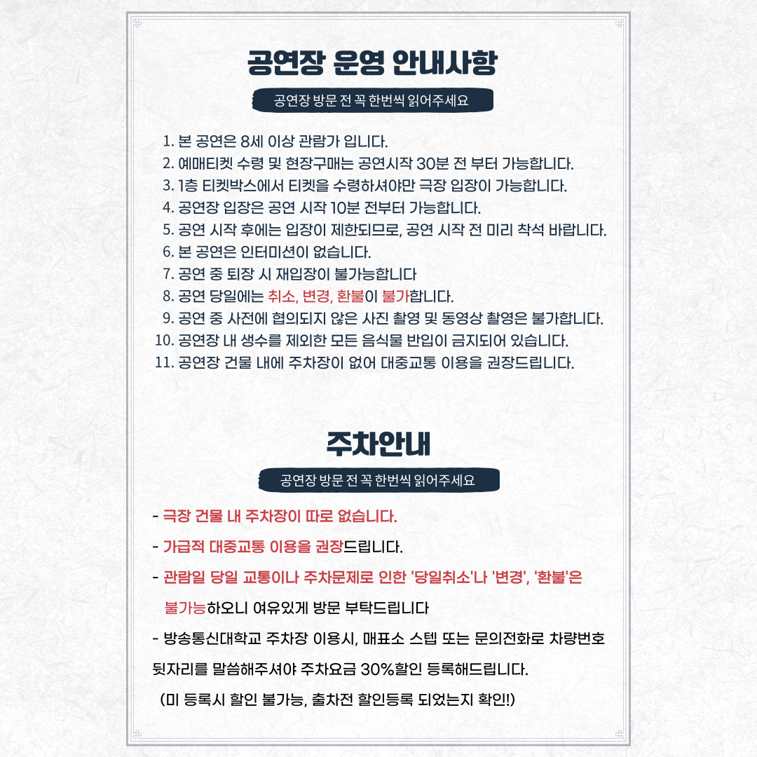- 관람일 2일전 ~ 취소기한까지: 티켓금액의 30%