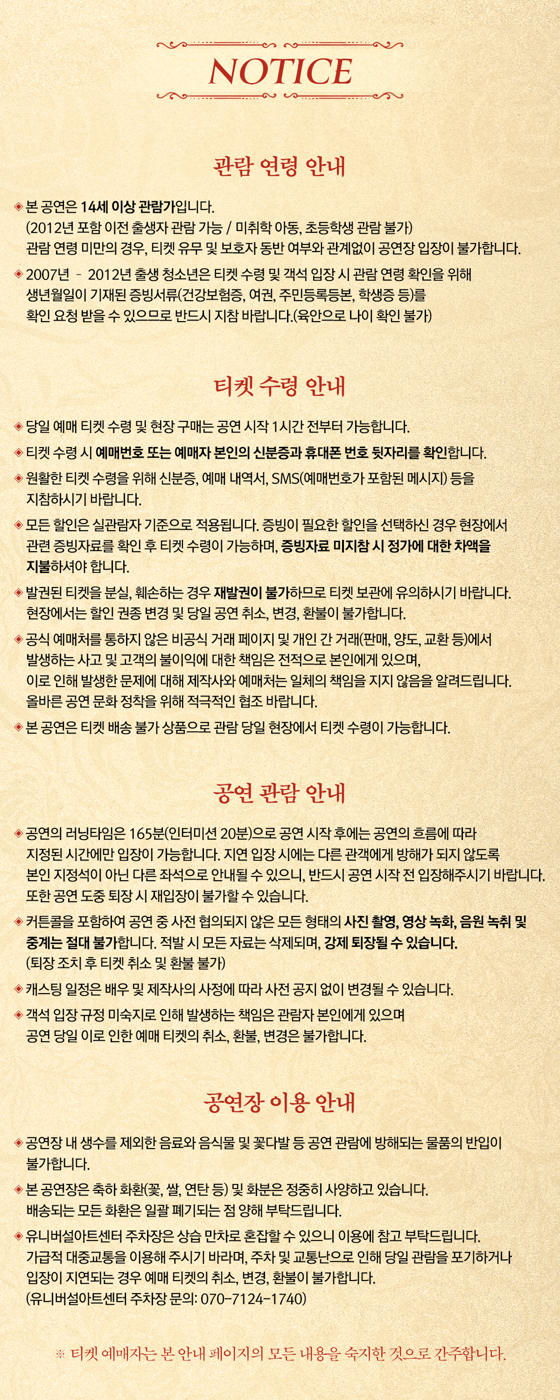 * 11월 25일(화) 19시 30분, 11월 26일(수) 19시 30분, 11월 27일(목) 19시 30분 공연은 전관으로 판매 마감되었습니다.
