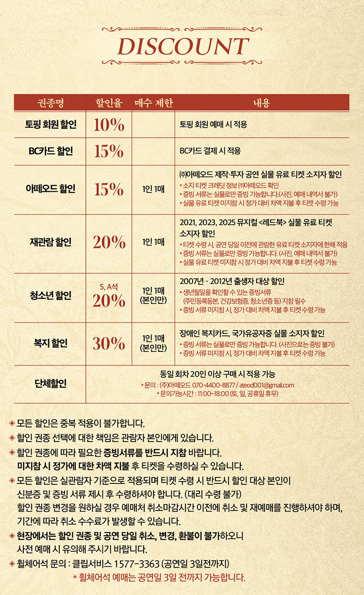 - 특정 기간, 특정 공연일에만 판매하는 가격이 있으니 예매 전 [가격 전체 보기]를 눌러 확인해 주세요.