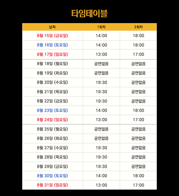 수,목,금 19시 30분 / 토요일 14시, 18시 / 일요일 13시, 17시 / 월, 화 공연 없음