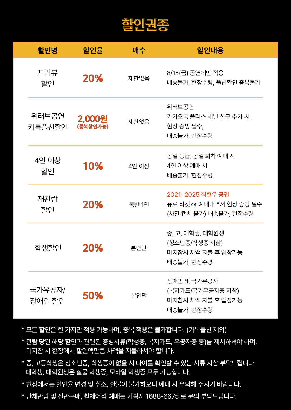 - 관람일 2일전 ~ 취소기한까지: 티켓금액의 30%