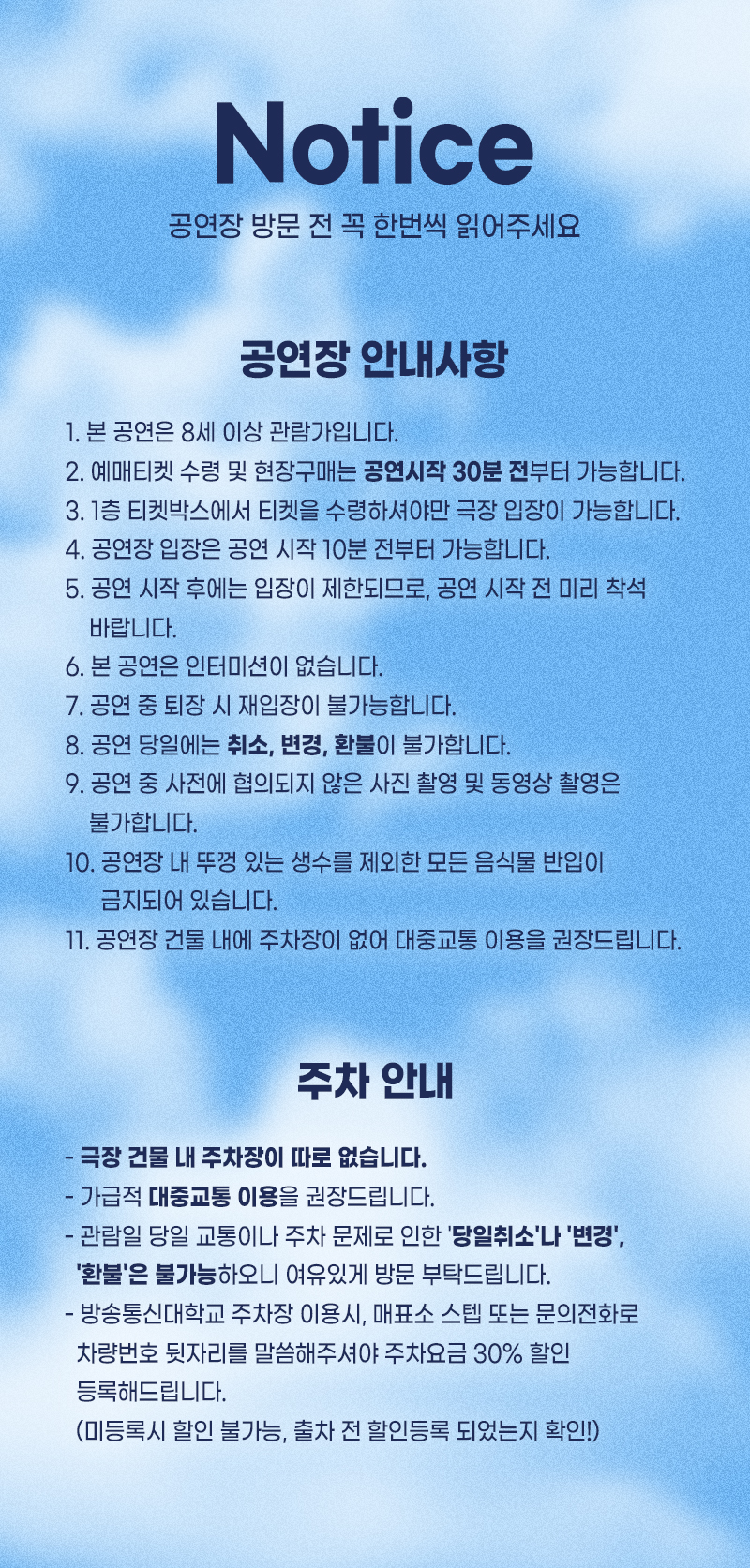 - 예매 후 7일 이내 취소시 티켓 금액 전액이 환불됩니다.(예매 수수료 제외)