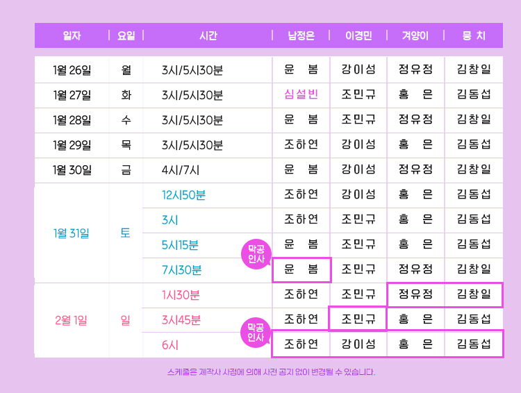 1시30분, 3시45분, 6시(1/25, 2/1)
