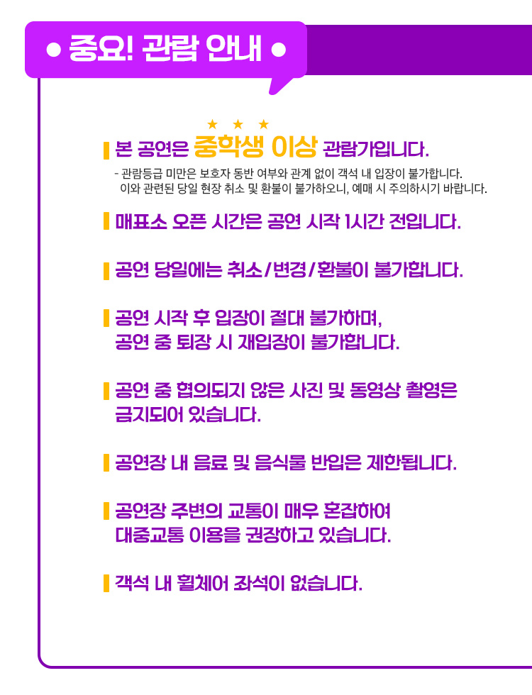 - 예매 후 7일 이내 취소시 티켓 금액 전액이 환불됩니다.(예매 수수료 제외)