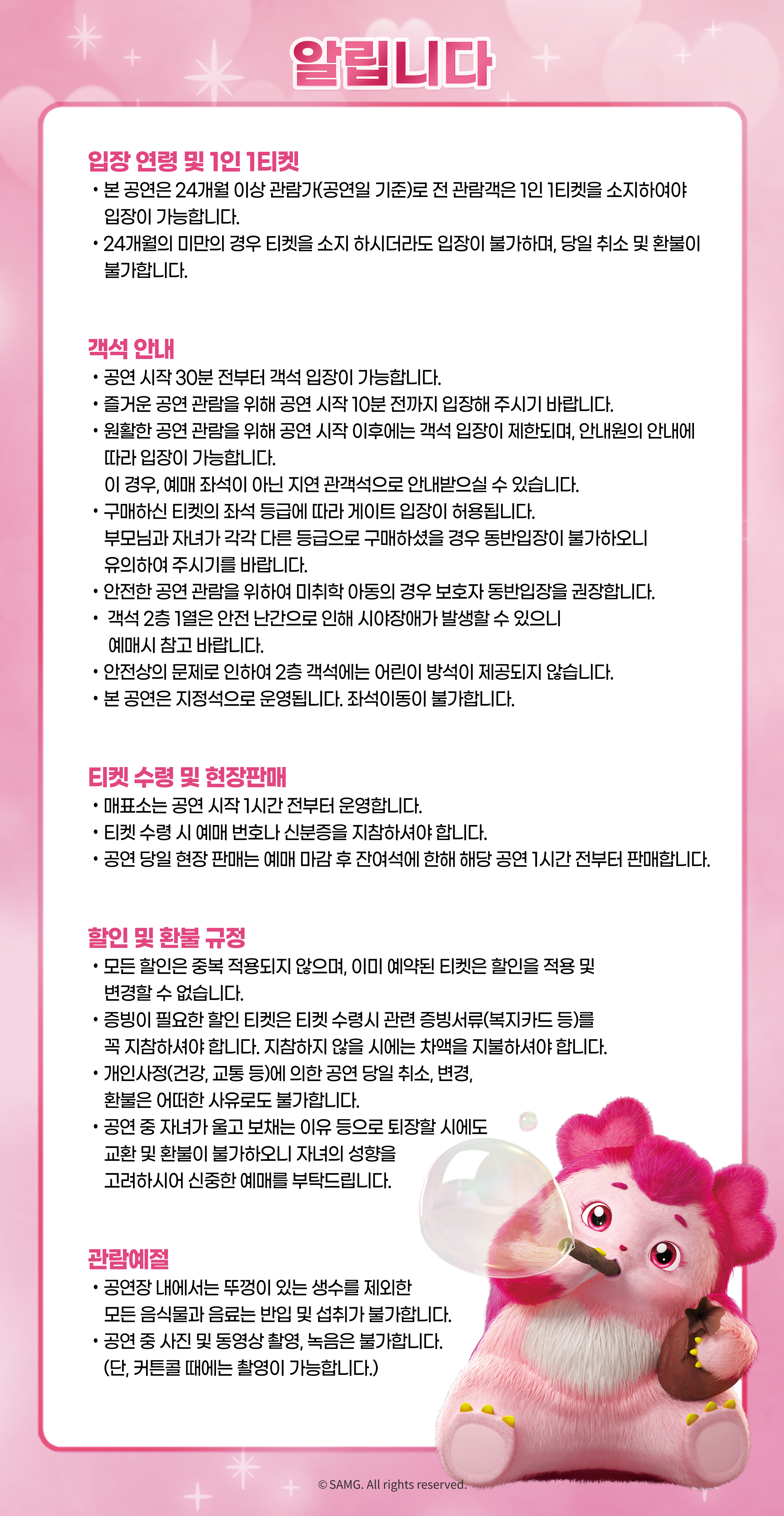 - 관람일 2일전 ~ 취소기한까지: 티켓금액의 30%