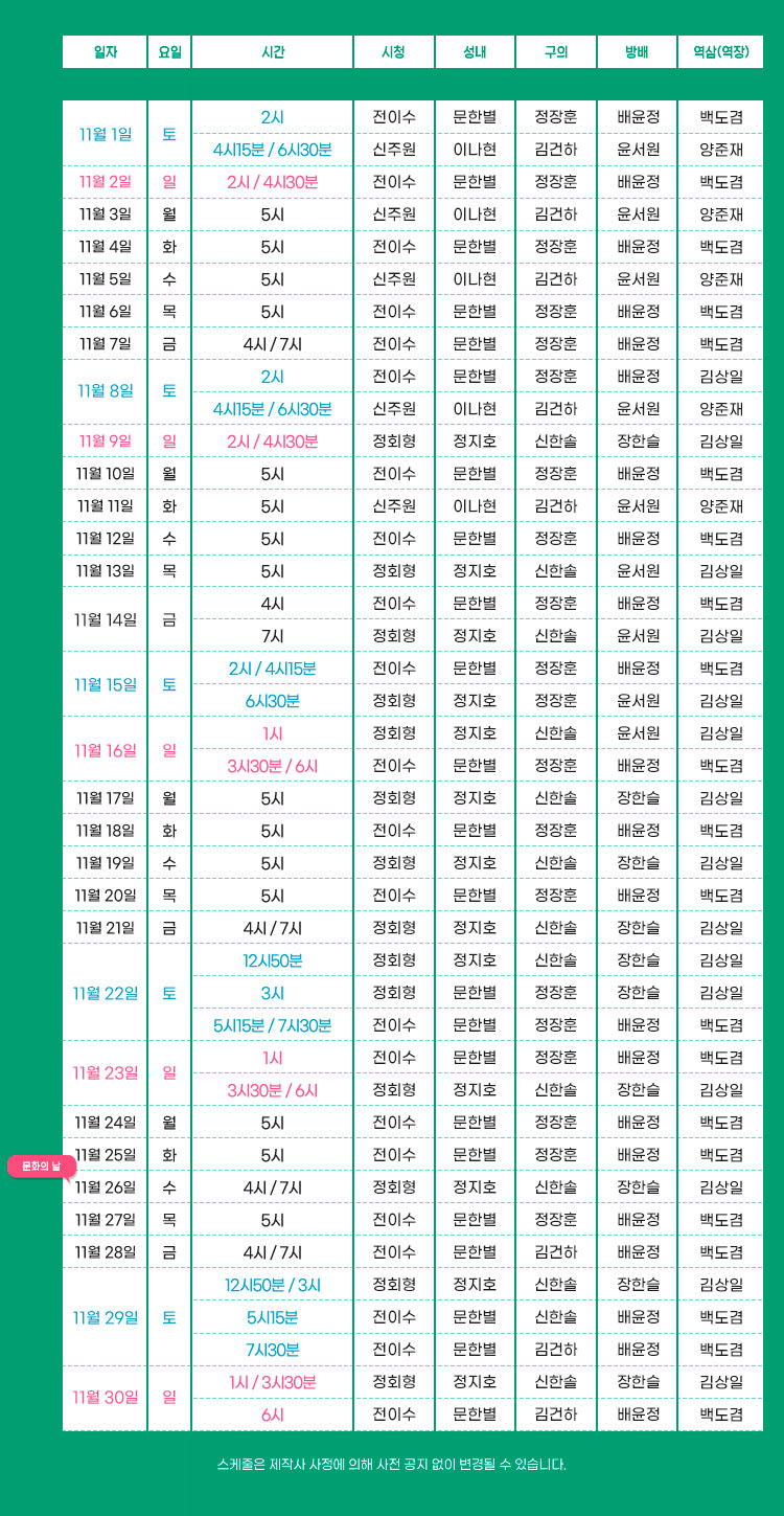 [일]14:00/16:30(11/2,9), 13:00/15:30/18:00(11/16,23,30)