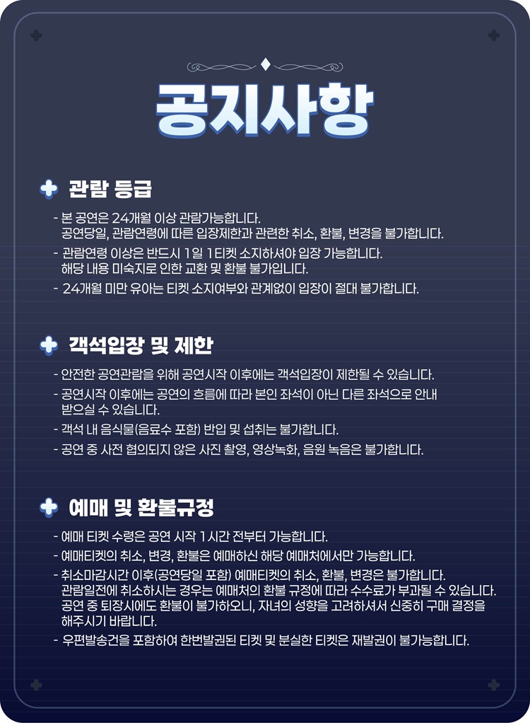 - 예매 후 7일 이내 취소시 티켓 금액 전액이 환불됩니다.(예매 수수료 제외)