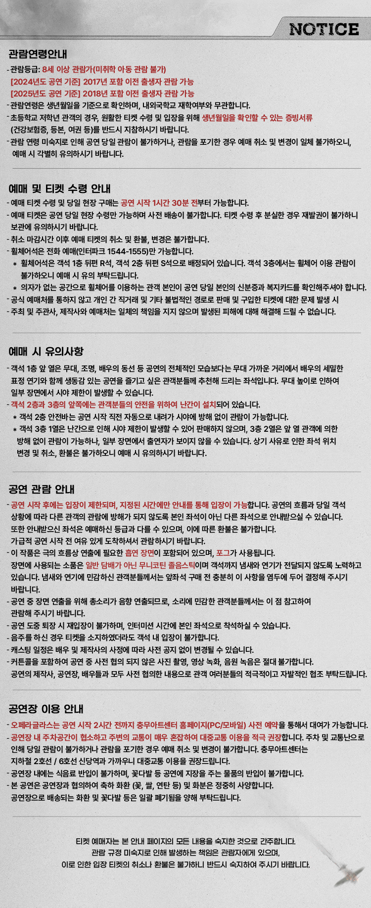 - 관람일 2일전 ~ 취소기한까지: 티켓금액의 30%