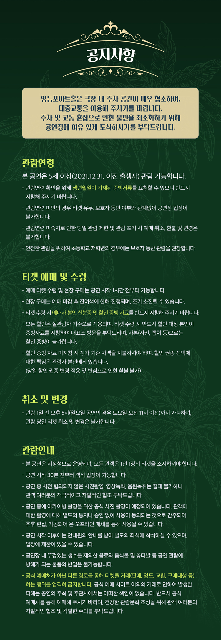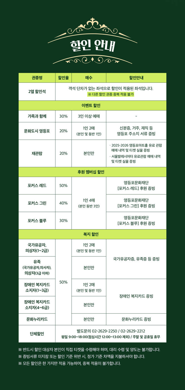 - 특정 기간, 특정 공연일에만 판매하는 가격이 있으니 예매 전 [가격 전체 보기]를 눌러 확인해 주세요.