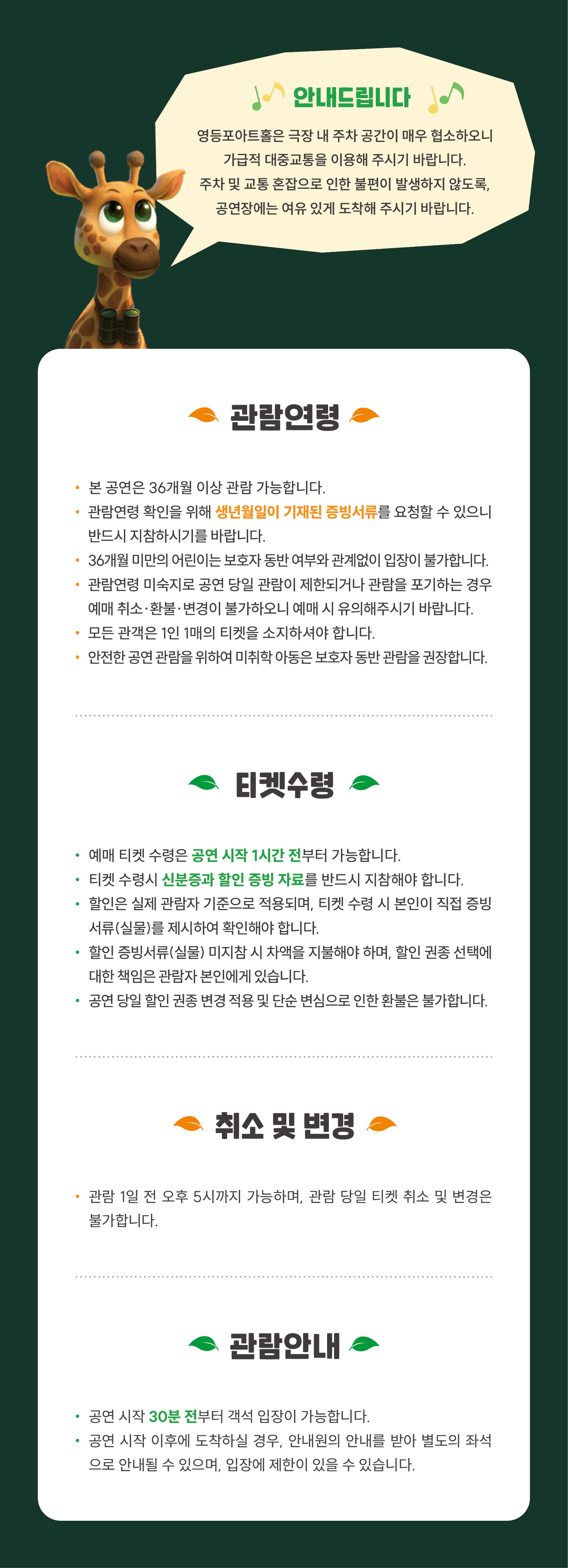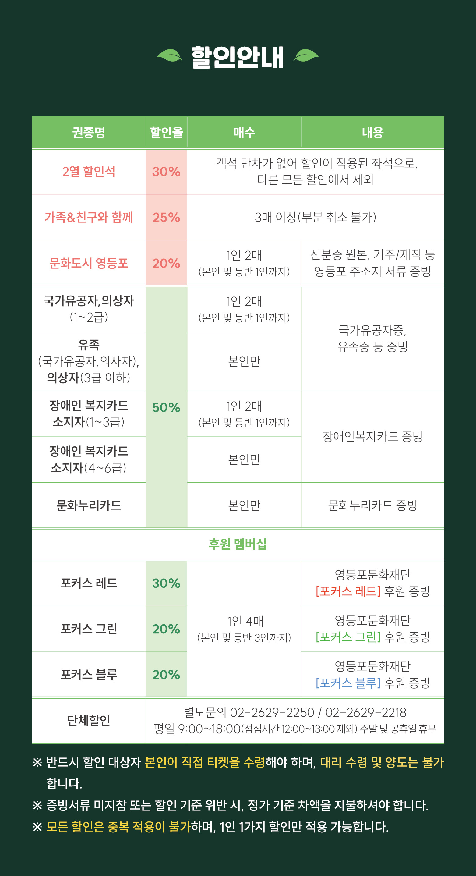 - 관람일 2일전 ~ 취소기한까지: 티켓금액의 30%