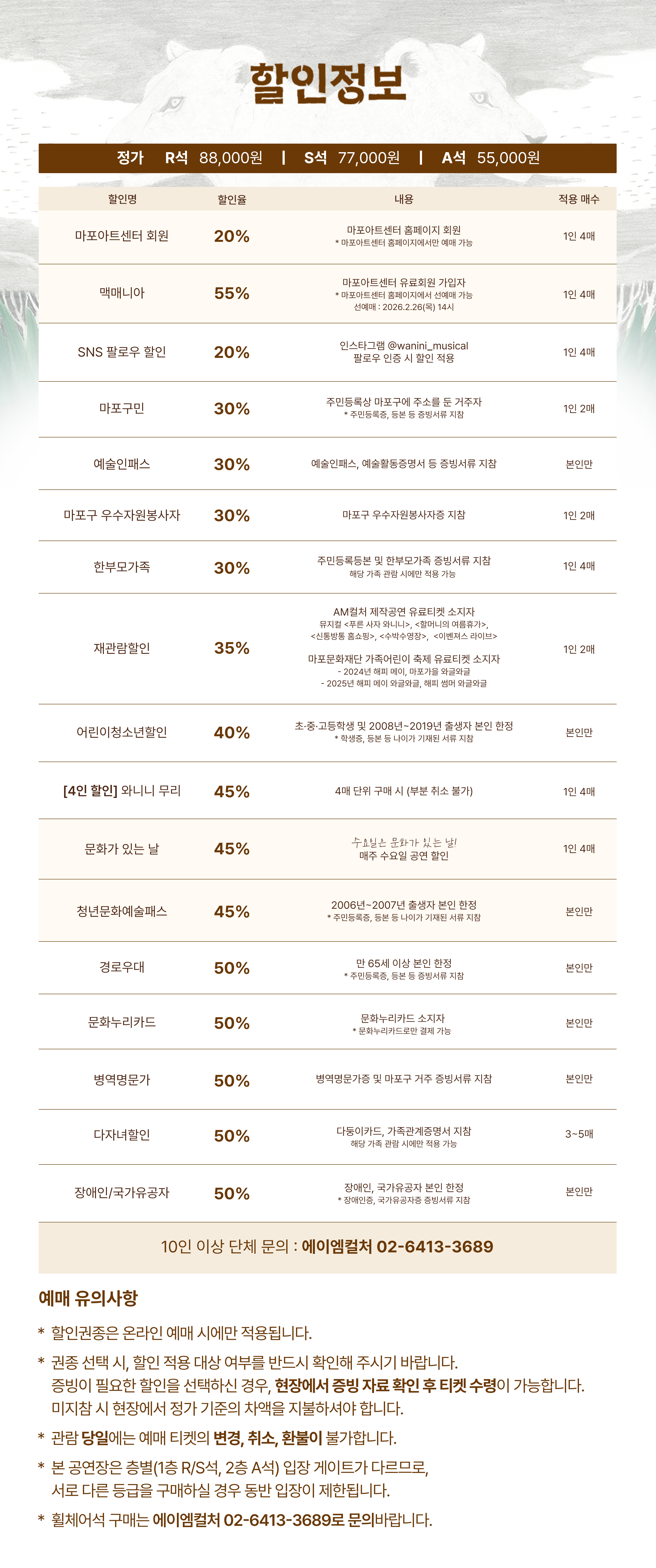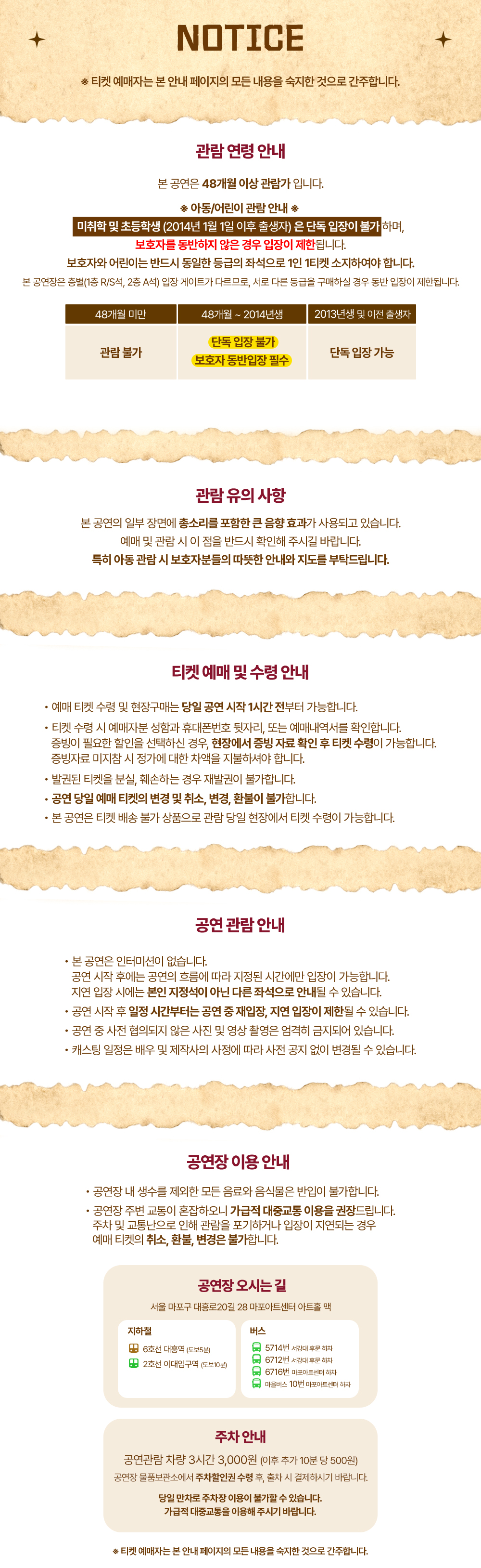 - 관람일 2일전 ~ 취소기한까지: 티켓금액의 30%