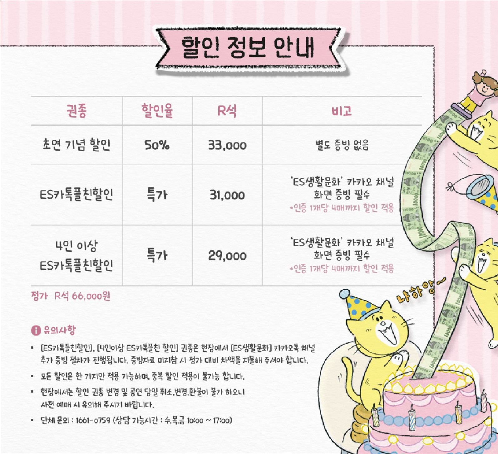 - 예매 후 7일 이내 취소시 티켓 금액 전액이 환불됩니다.(예매 수수료 제외)