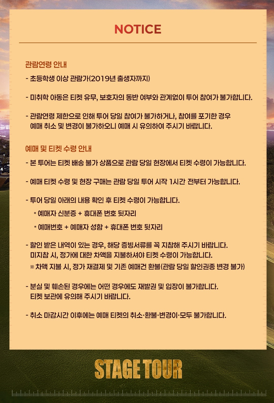 - 예매 후 7일 이내 취소시 티켓 금액 전액이 환불됩니다.(예매 수수료 제외)