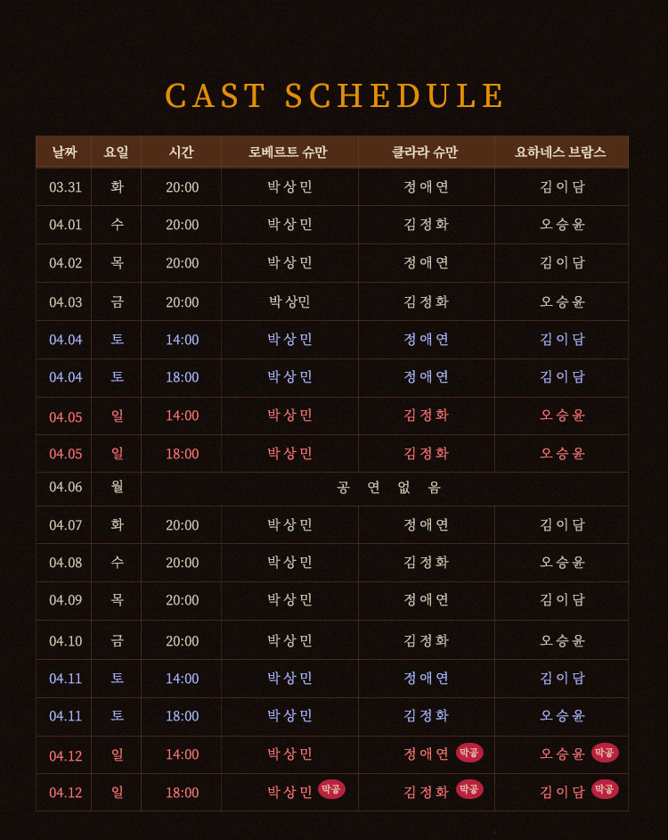 화, 수, 목, 금 20시 / 주말 및 공휴일 14시, 18시 (월요일 공연 없음)