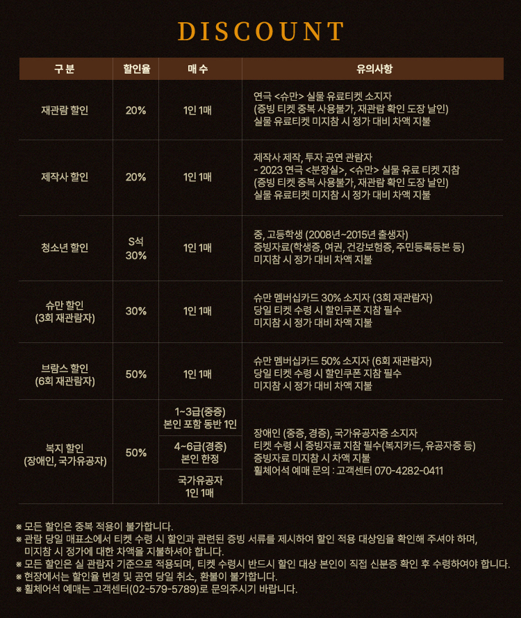 - 관람일 2일전 ~ 취소기한까지: 티켓금액의 30%