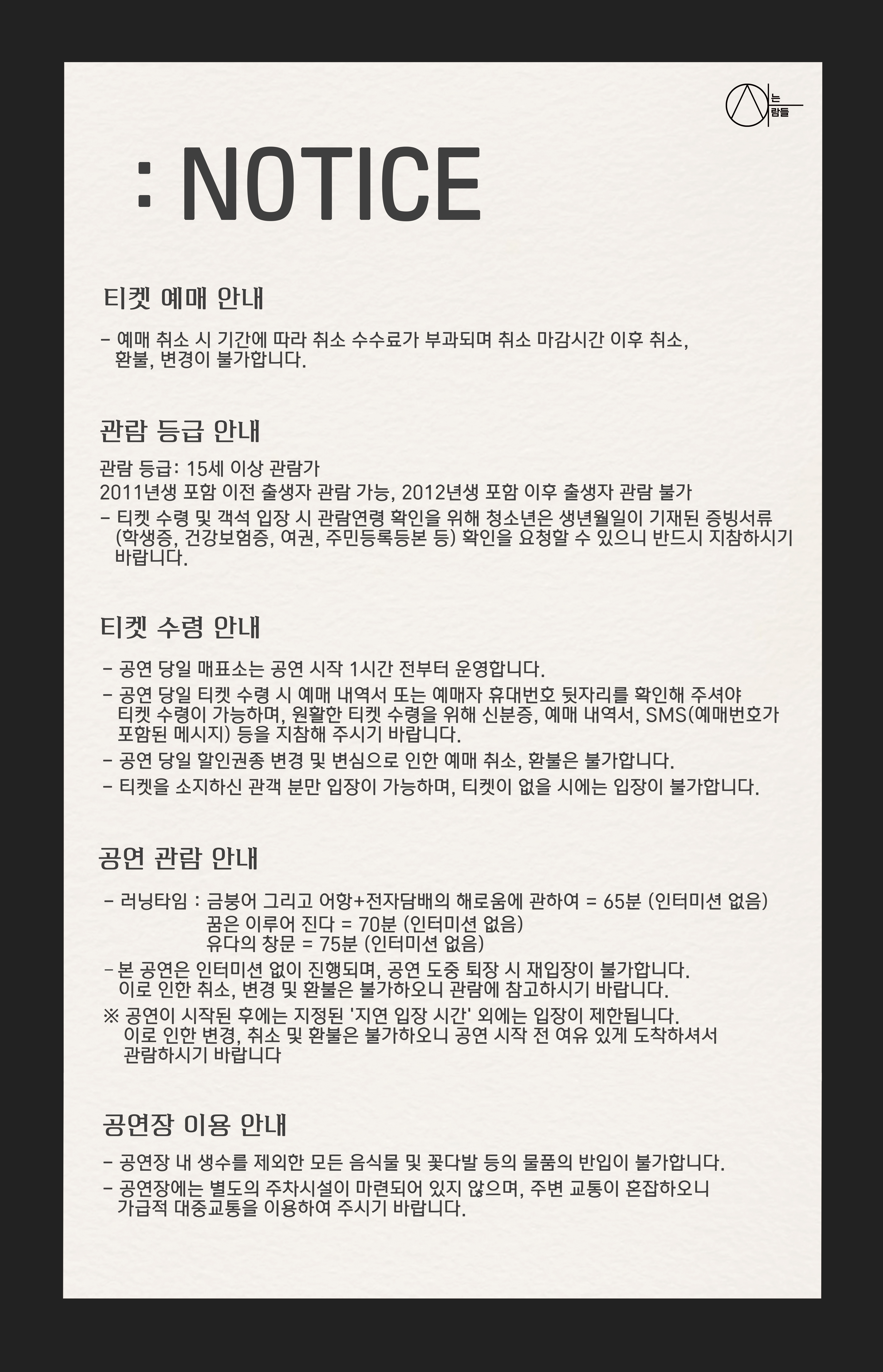 - 관람일 2일전 ~ 취소기한까지: 티켓금액의 30%