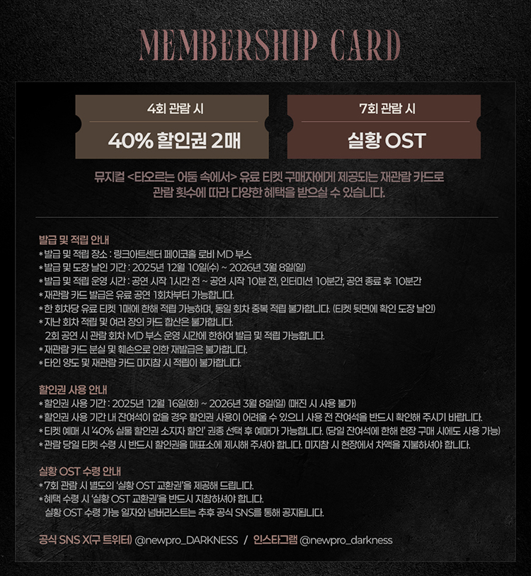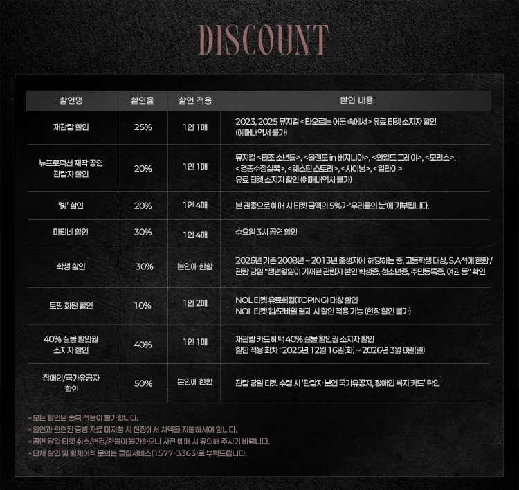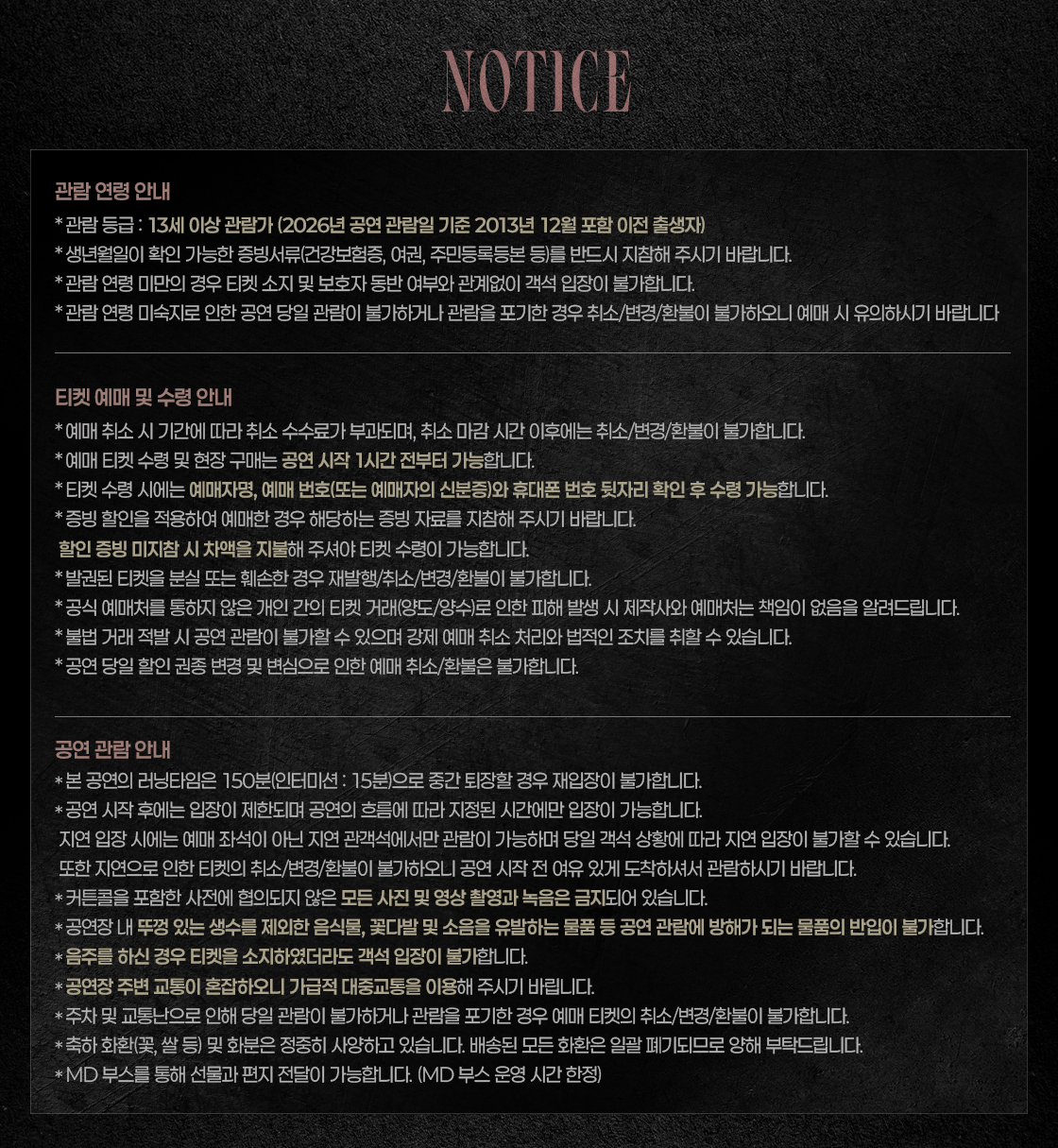 - 관람일 2일전 ~ 취소기한까지: 티켓금액의 30%