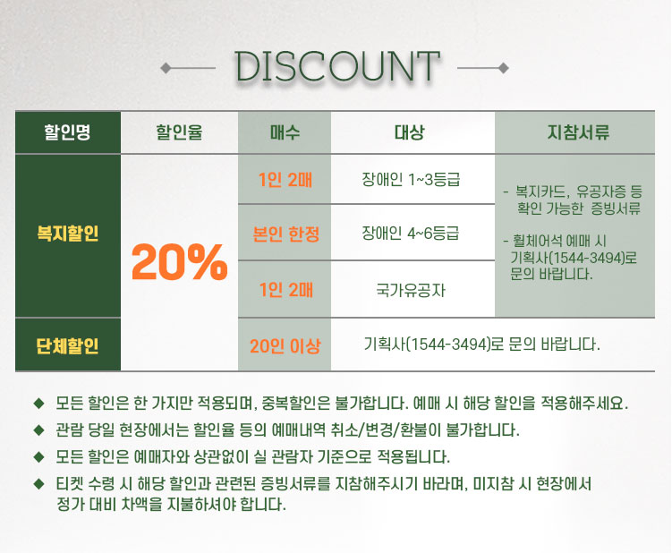 - 관람일 2일전 ~ 취소기한까지: 티켓금액의 30%