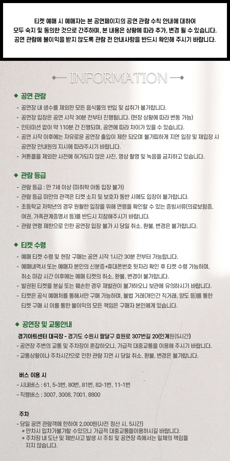 - 특정 기간, 특정 공연일에만 판매하는 가격이 있으니 예매 전 [가격 전체 보기]를 눌러 확인해 주세요.