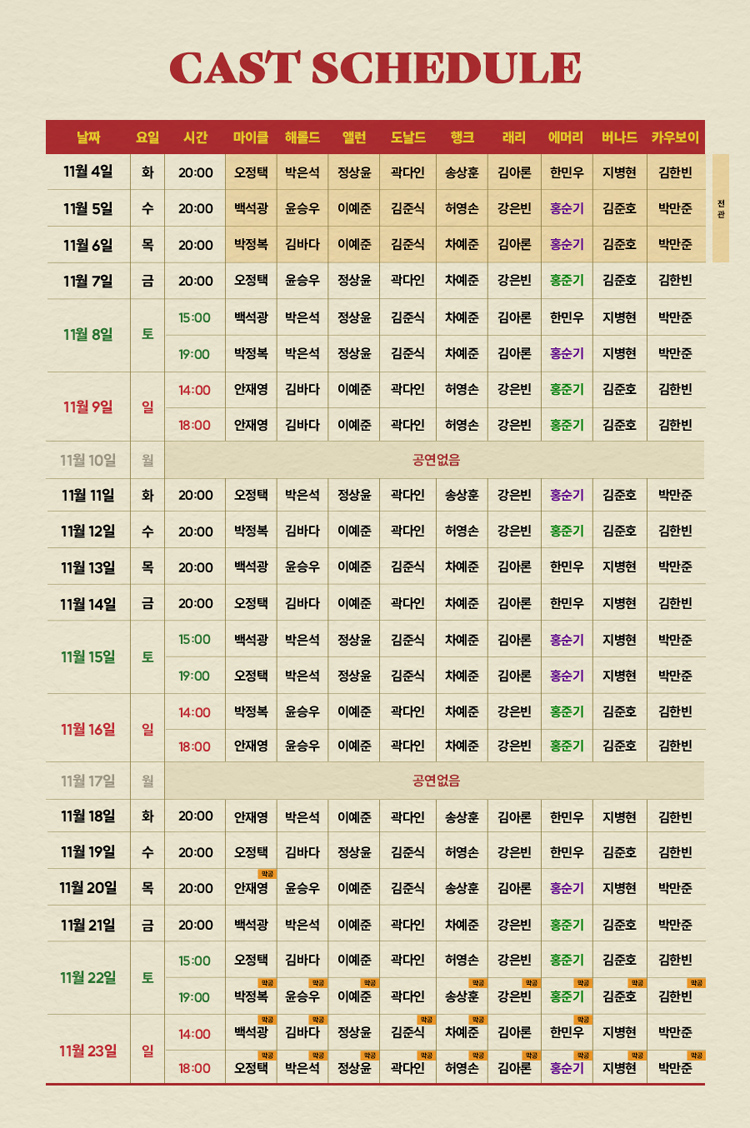 화,수,목,금 8시 / 토요일 3시, 7시 / 일요일 및 공휴일 2시, 6시 / 월 공연없음