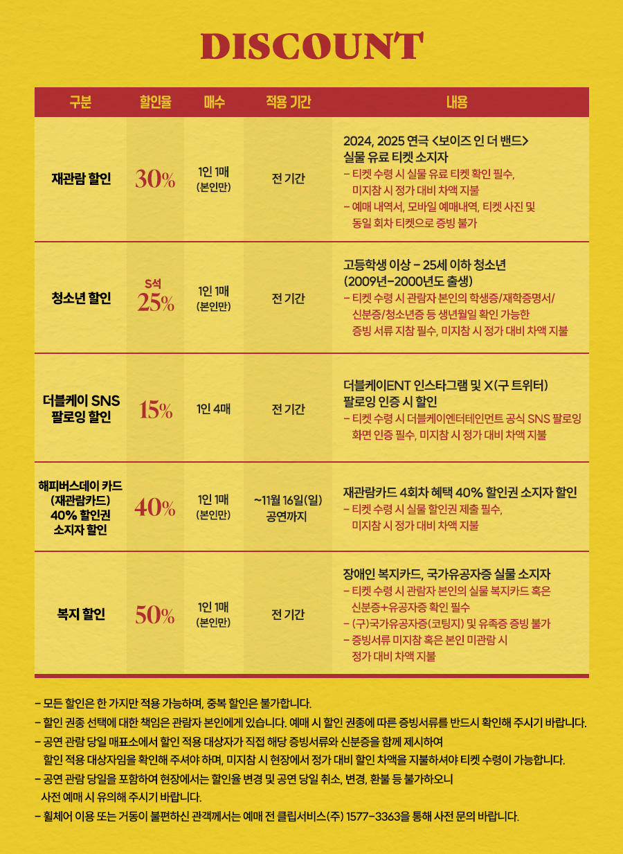 - 특정 기간, 특정 공연일에만 판매하는 가격이 있으니 예매 전 [가격 전체 보기]를 눌러 확인해 주세요.